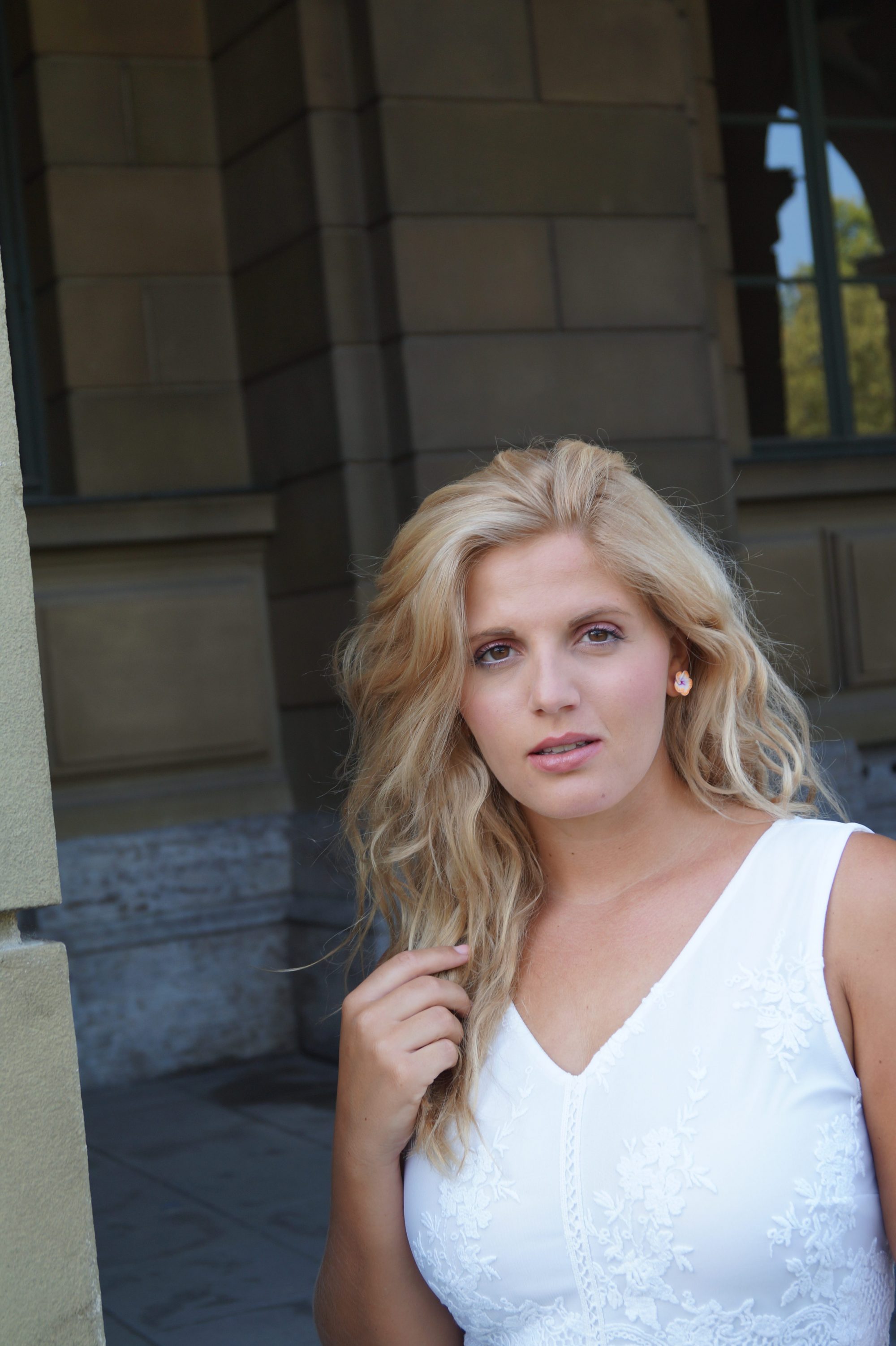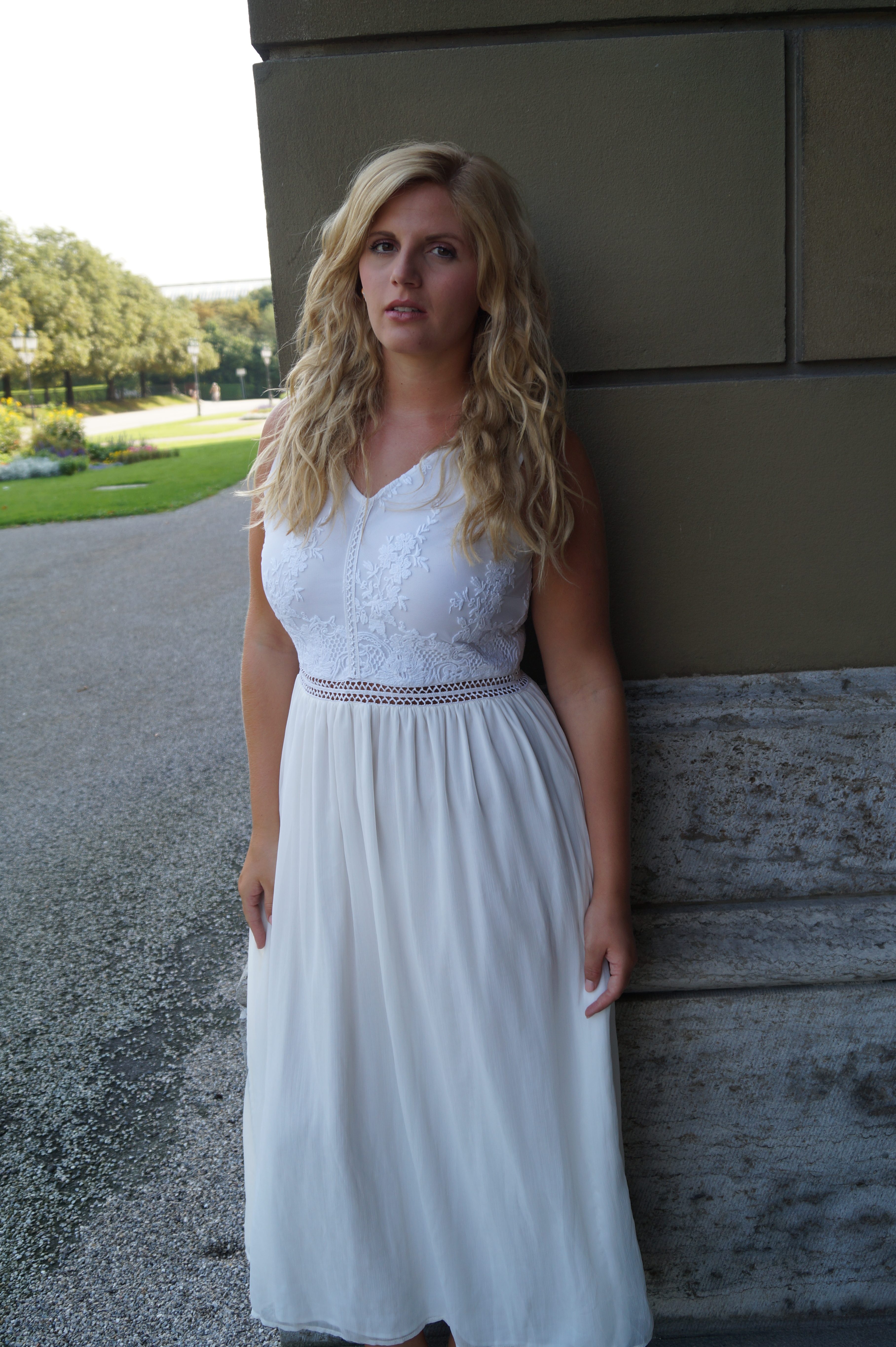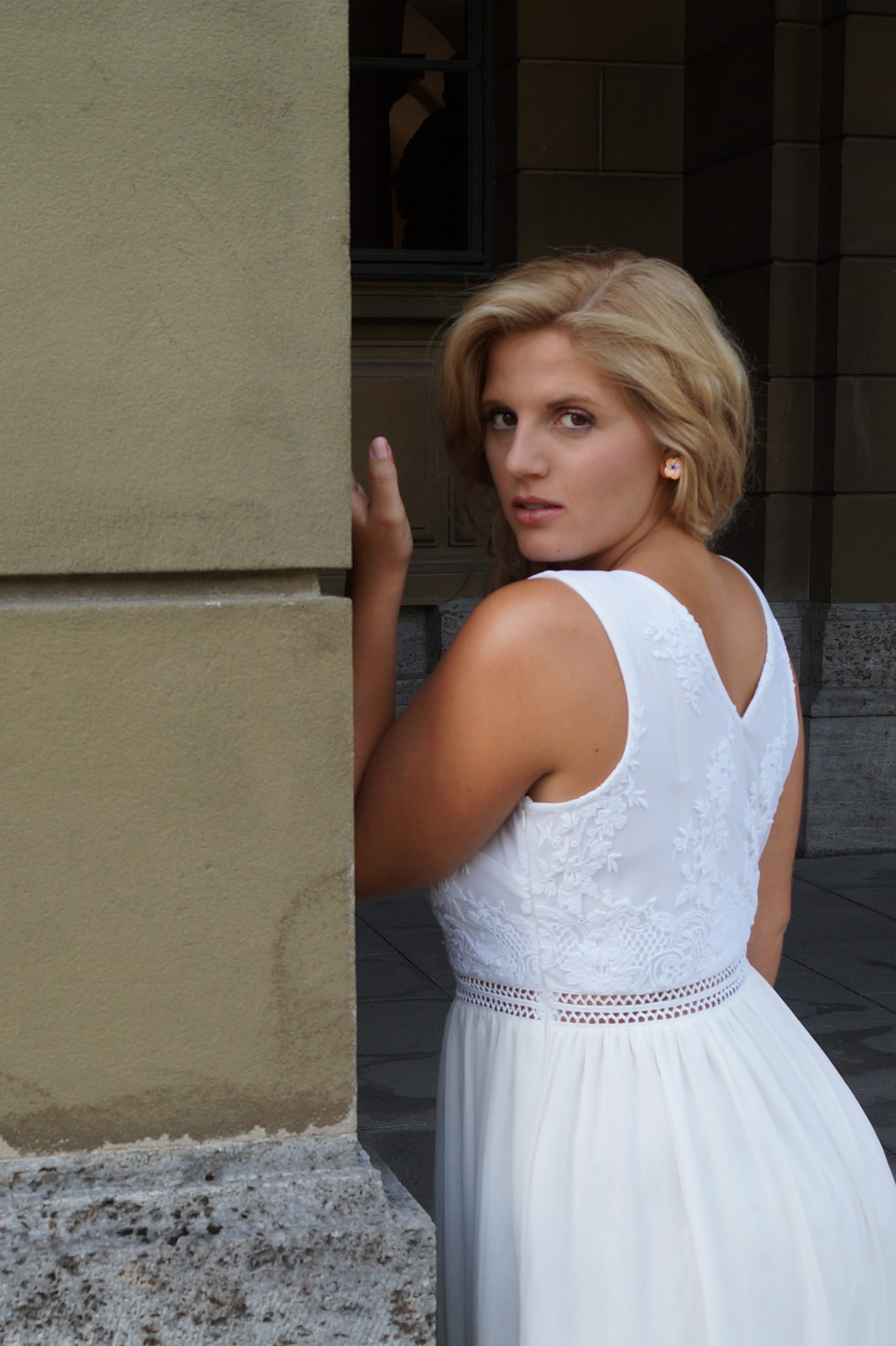 In der schlichten Variante, trage ich nur das Kleid, Sandalen und kleine Blumenohrringe dazu. Durch die verzierte Spitze im oberen Bereich und dem neckischen Ausschnitt an der Taille kann man das Kleid auch ohne viel Tam Tam tragen. Zu weiß passt außerdem jede Farbe, also einfach deine Lieblingshandtasche geschnappt und los geht’s !
