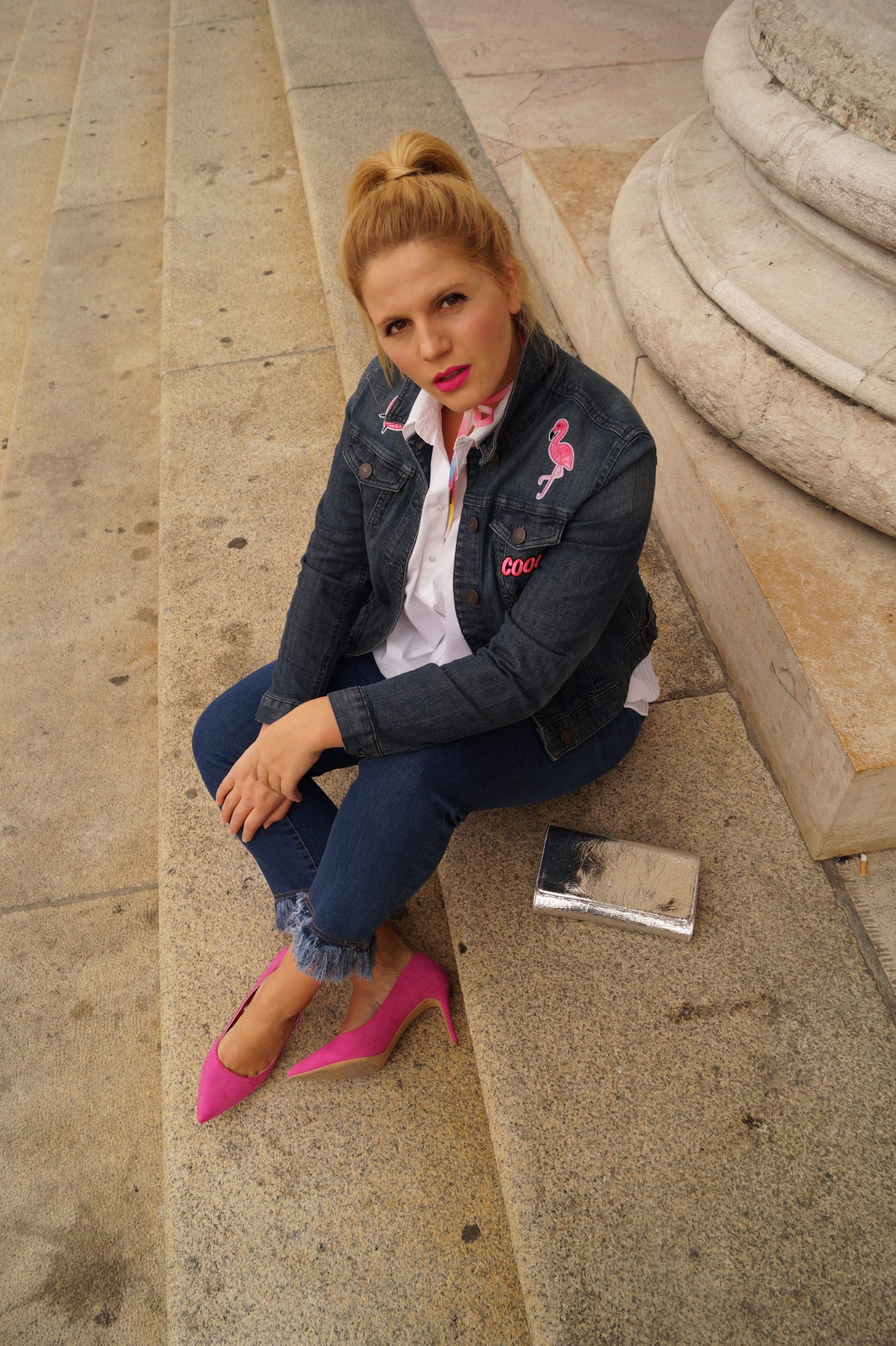 Da mir Denim allein ein bisschen zu neutral ist, habe ich das ganze mit pinken und silbernen Accessoires kombiniert. Das peppt den ganzen Look nochmal richtig auf. Die Jeansjacke als solche, ist bei Sheego erhältlich, die pinken Patches habe ich allerdings selber darauf gebügelt. Ihr könnt eure Jeansjacken nach Belieben mit allen möglichen Patches verzieren. Diese könnt ihr entweder bei Sheego direkt dazu bestellen, oder aber ihr schaut in Bastel-Läden nach ganz besonderen Stücken.