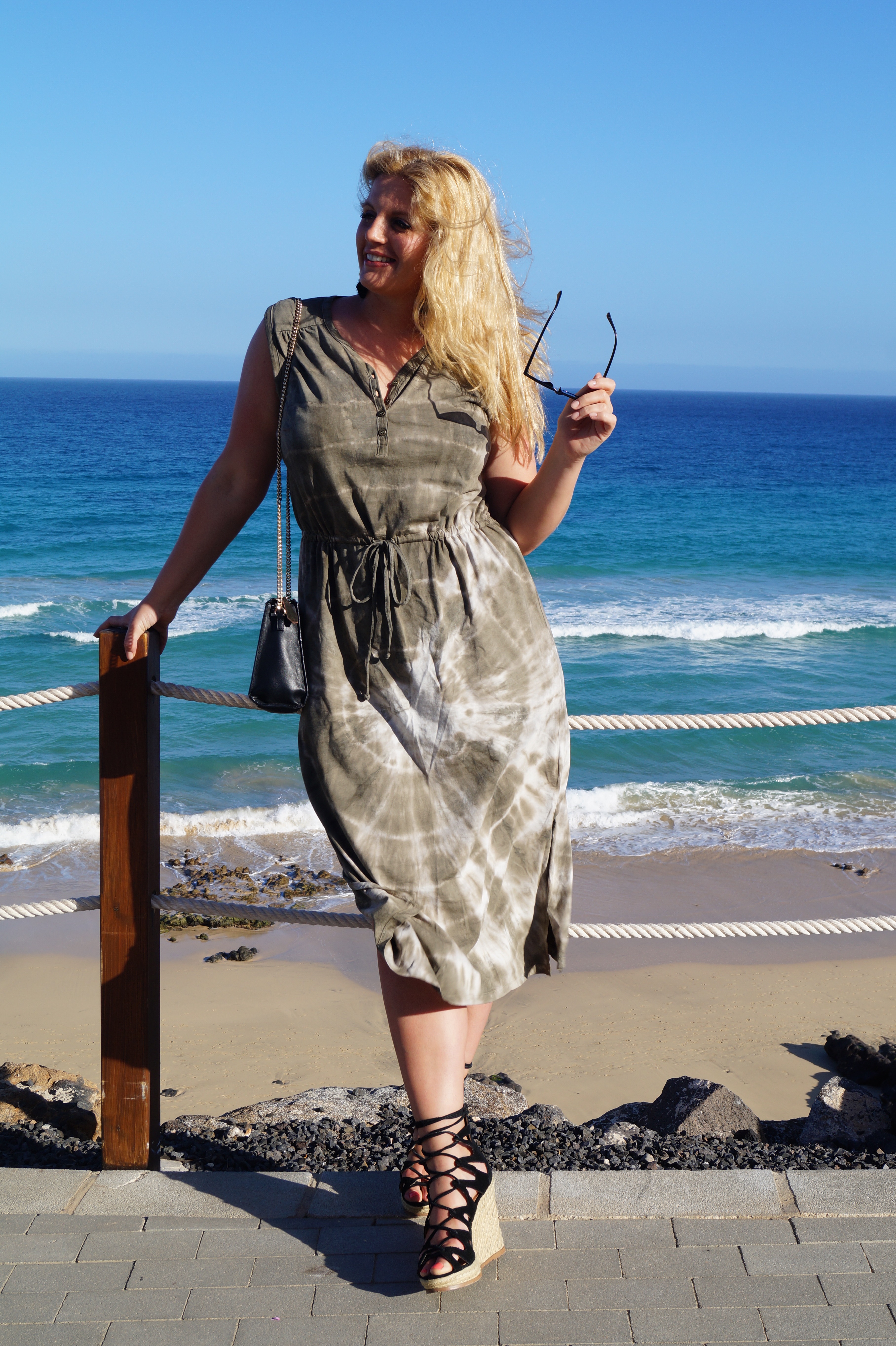 Zum einen dieses sommerliche Kleid im Batik-Look in dunklem Khaki. Das Kleid lässt sich super mit jeder Art von Sandale kombinieren, egal ob flach oder hoch. Ob ihr es zum Strand, zum Stadtbummel oder zum Abendessen anzieht, das Kleid passt perfekt in euren Urlaubs-Koffer. Ich finde, es versprüht automatisch ein Urlaubs-Feeling, oder was meint ihr? Ich kann mich noch erinnern, als ich als kleines Kind im Urlaub mal mein eigenes Batik T-Shirt anfertigen durfte, das war damals schon der Hit! 20 Jahre später, habe ich den Look nun als Kleid, und überlege schon, welches meiner alten Kleider ich vielleicht auch so umgestalten könnte, das geht doch irgendwie ganz einfach, kann ich mich erinnern, mit einem Haargummi oder so…? Wie dem auch sei, am einfachsten und schönsten ist es natürlich, ihr bestellt euch das Kleid direkt bei SheegoFashion online, dann gibts auch keine Sauerei daheim. Es gibt davon eh verschiedene Farben, klickt euch mal rein, die anderen sind auch total schön!
