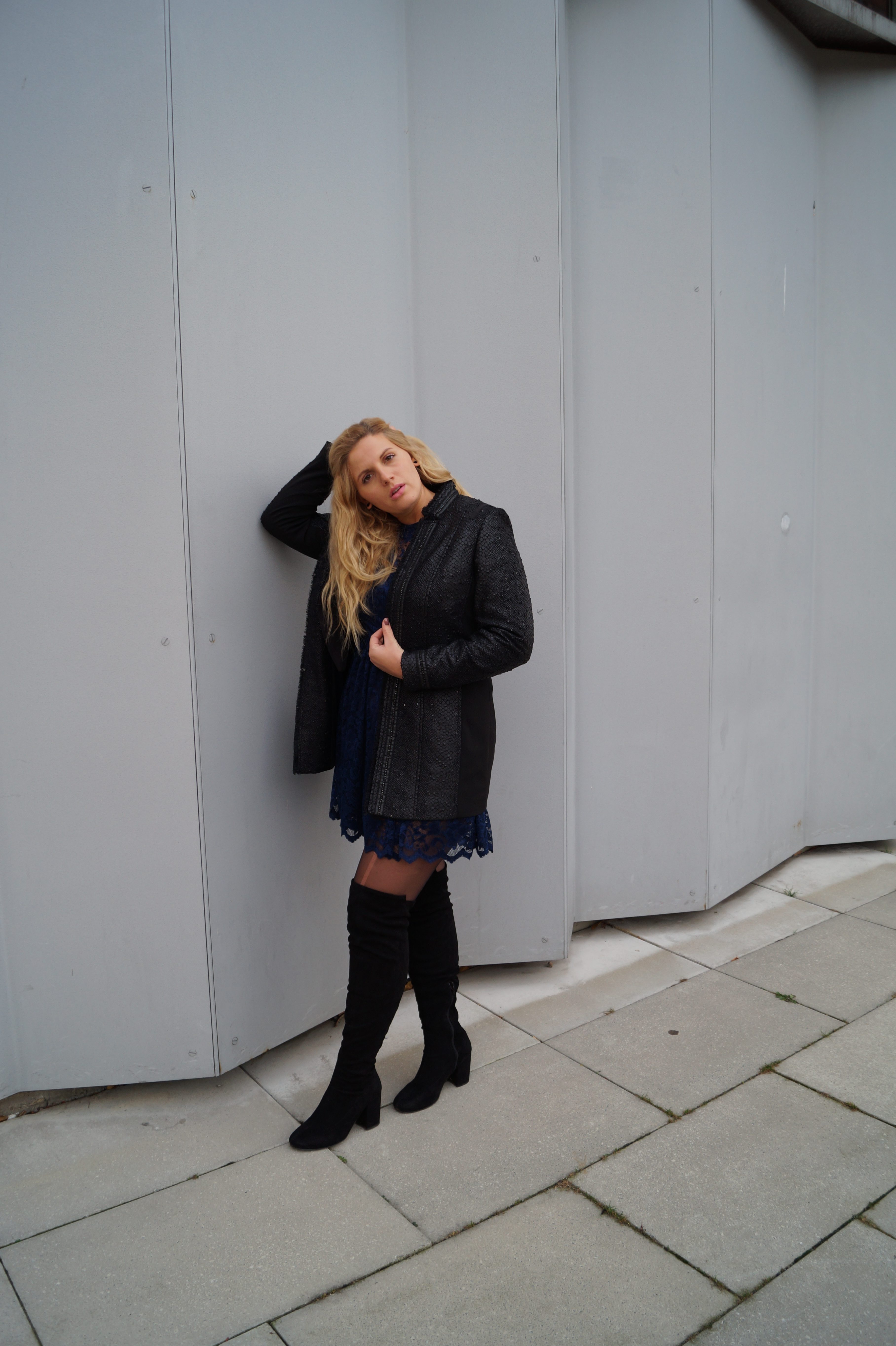 Die Bilder sind absichtlich in der Abenddämmerung entstanden, da das so gut zu meiner Interpretation dieses Styles gepasst hat. Verrucht, edgy, dark, geheimnisvoll, sexy, stark und weiblich. All das strahlt dieser Look für mich aus! Natürlich kann man dieses tolle figurumschmeichelnde Kleid auch mit einem ganz normalen, schlichten Blazer kombinieren, in schwarz oder mit einer knalligen Farbe. Dunkelrote Heels oder flache bequeme schwarze Schuhe, sieht alles top aus.